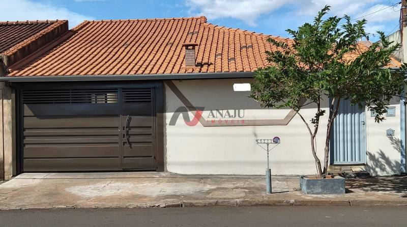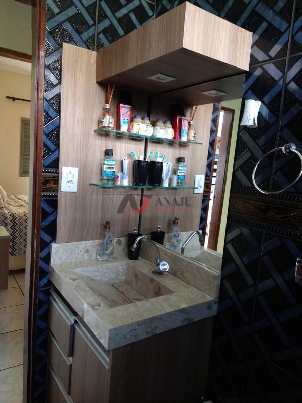 Casa térrea da frente tem 3 quartos, quarto de casal com cabeceira da cama modulada, home theater e ar-condicionado, 1 quarto tem um closet, ventiladores nos quartos e na sala, cozinha, banheiro, área de serviço, com uma churrasqueira, garagem para 2 carros e motos, quintal
